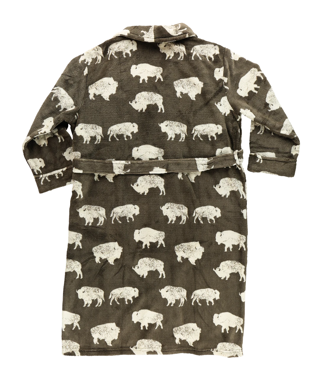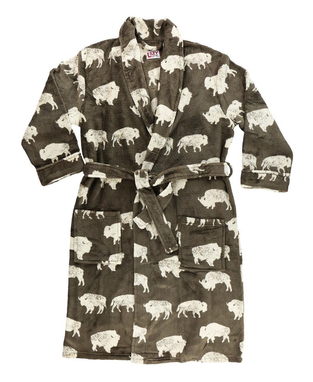 When it’s time to roam from the bed to the couch or fridge be comfortable and warm in our Bison men’s bathrobe. Our Bison bathrobe features an all over bison silhouette design on a soft dark brown robe. This robe is warm and super plushy and feature two deep, roomy side pockets. No matter where you roam may you roam in comfort in the Bison men’s robe.Â