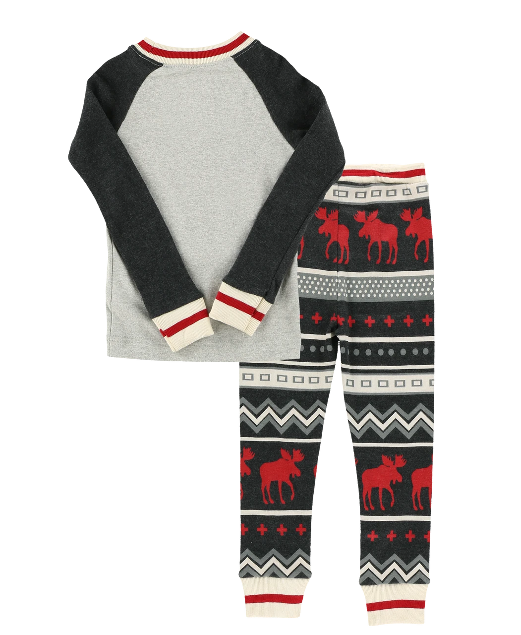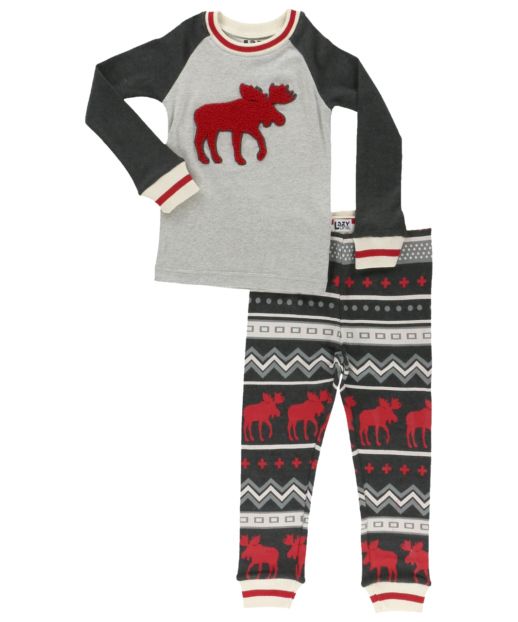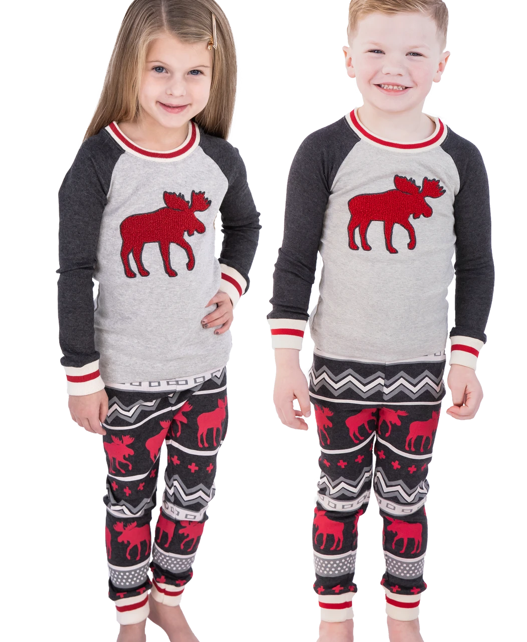 Our little one will love the look and feel of our Cabin Moose Kid PJ Set. These jammies are made from soft 100% combed cotton rib and have a snug, flexible fit. Featuring a fun red terry applique moose design on the tee and a dark moose fair isle design on the pant.  Get Christmas pajamas for the whole family with our Cabin Moose matching family pajamas.