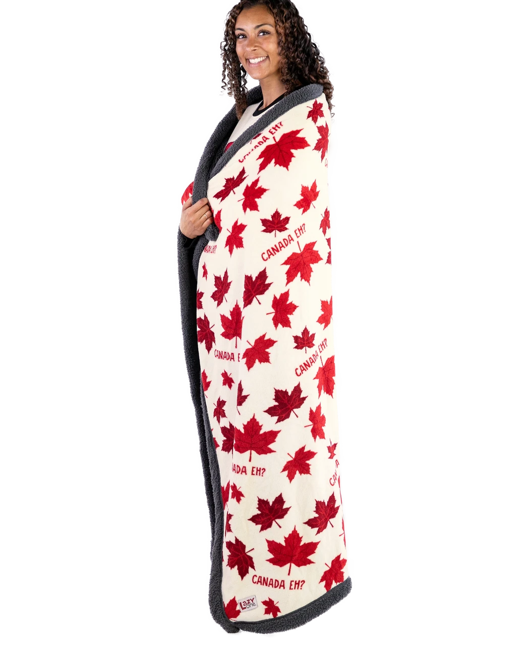 Be ready for those cold Canadian nights with our Canada Eh Sherpa throw blanket. This blanket features an all over Canadian Maple Leaf design with a dark grey fleece lining. Our throw blankets are made from soft coral fleece on the front and thick, plushy sherpa on the back to help you stay warm on those cold nights.