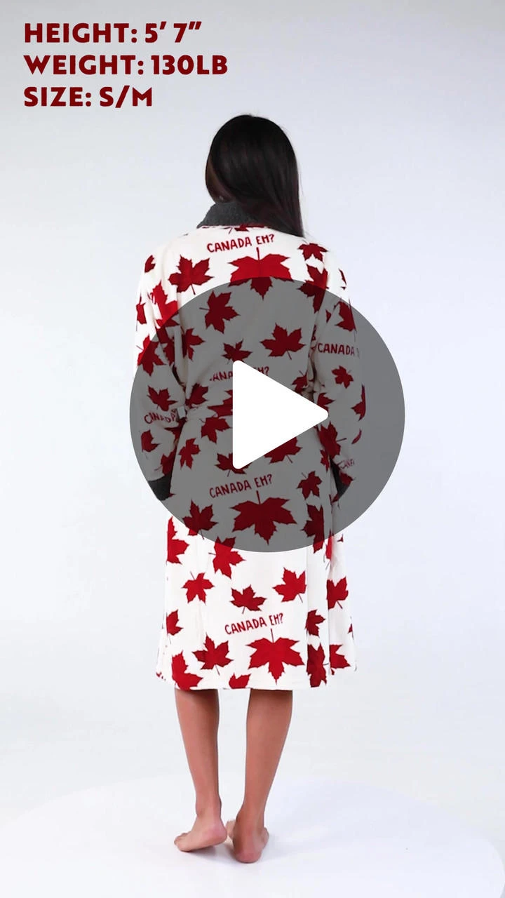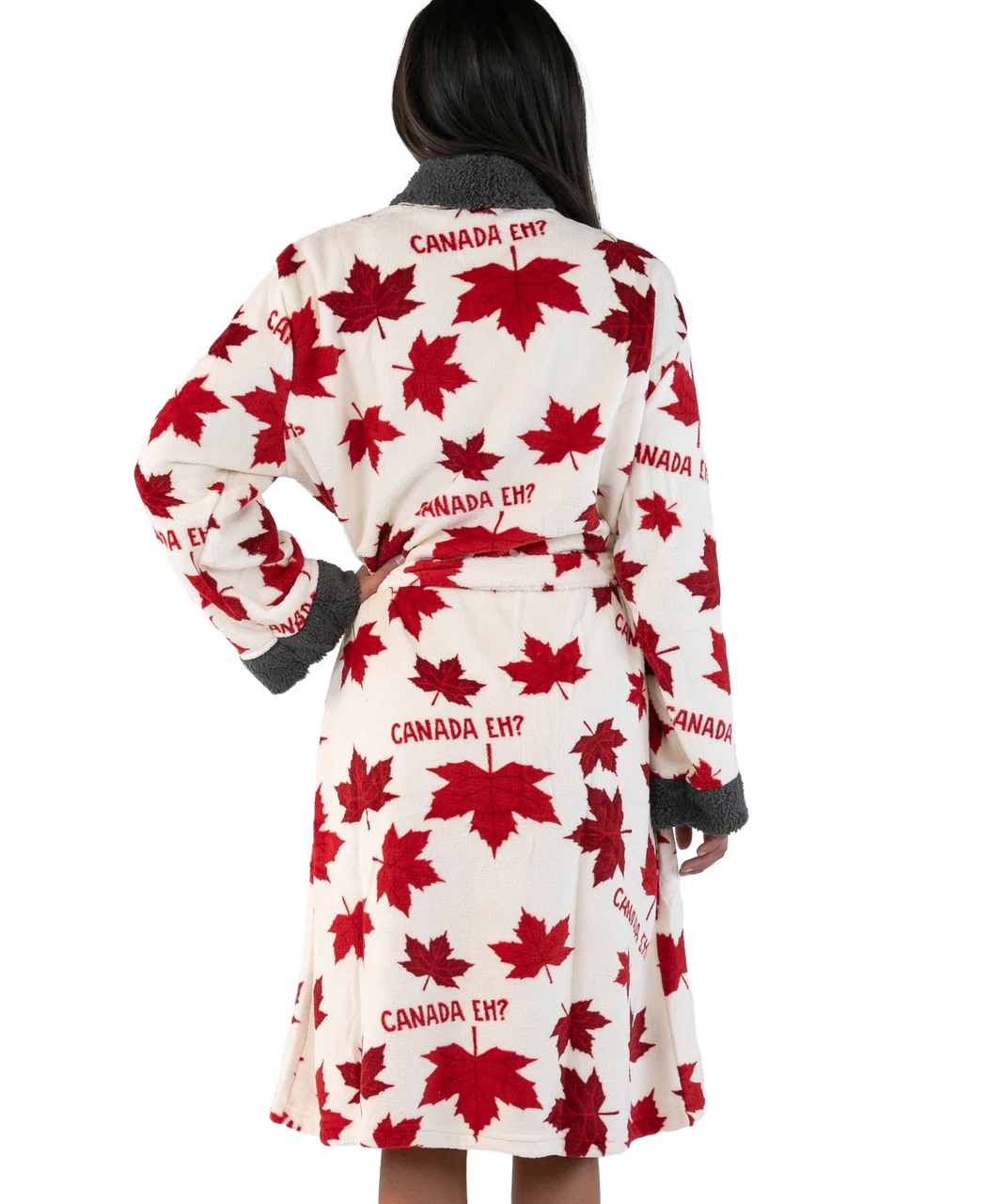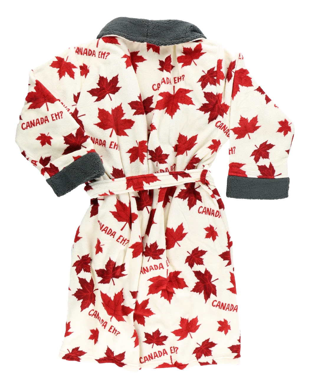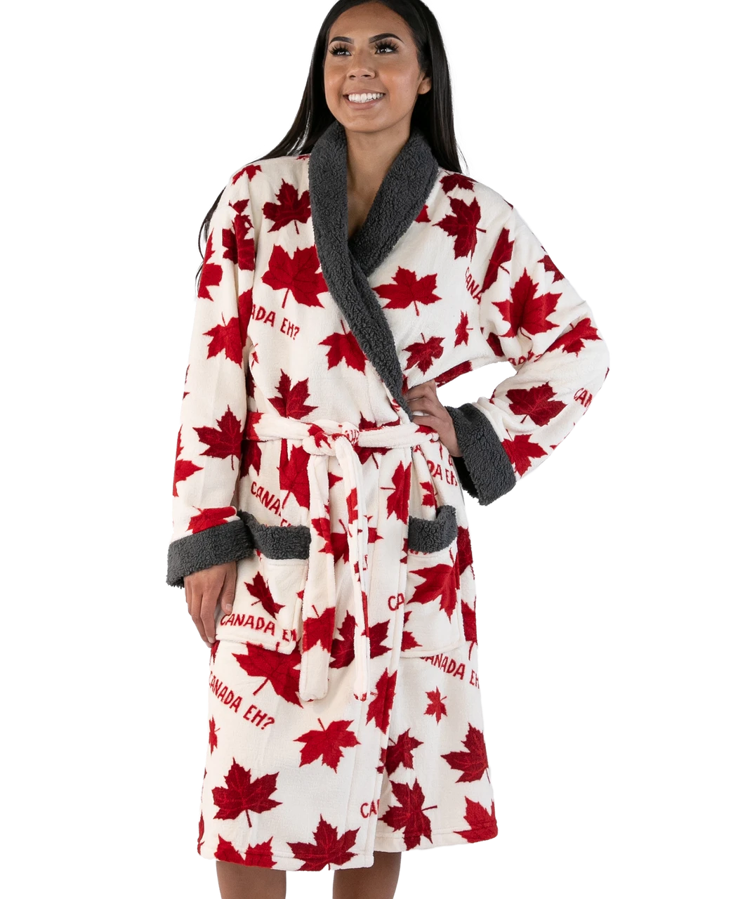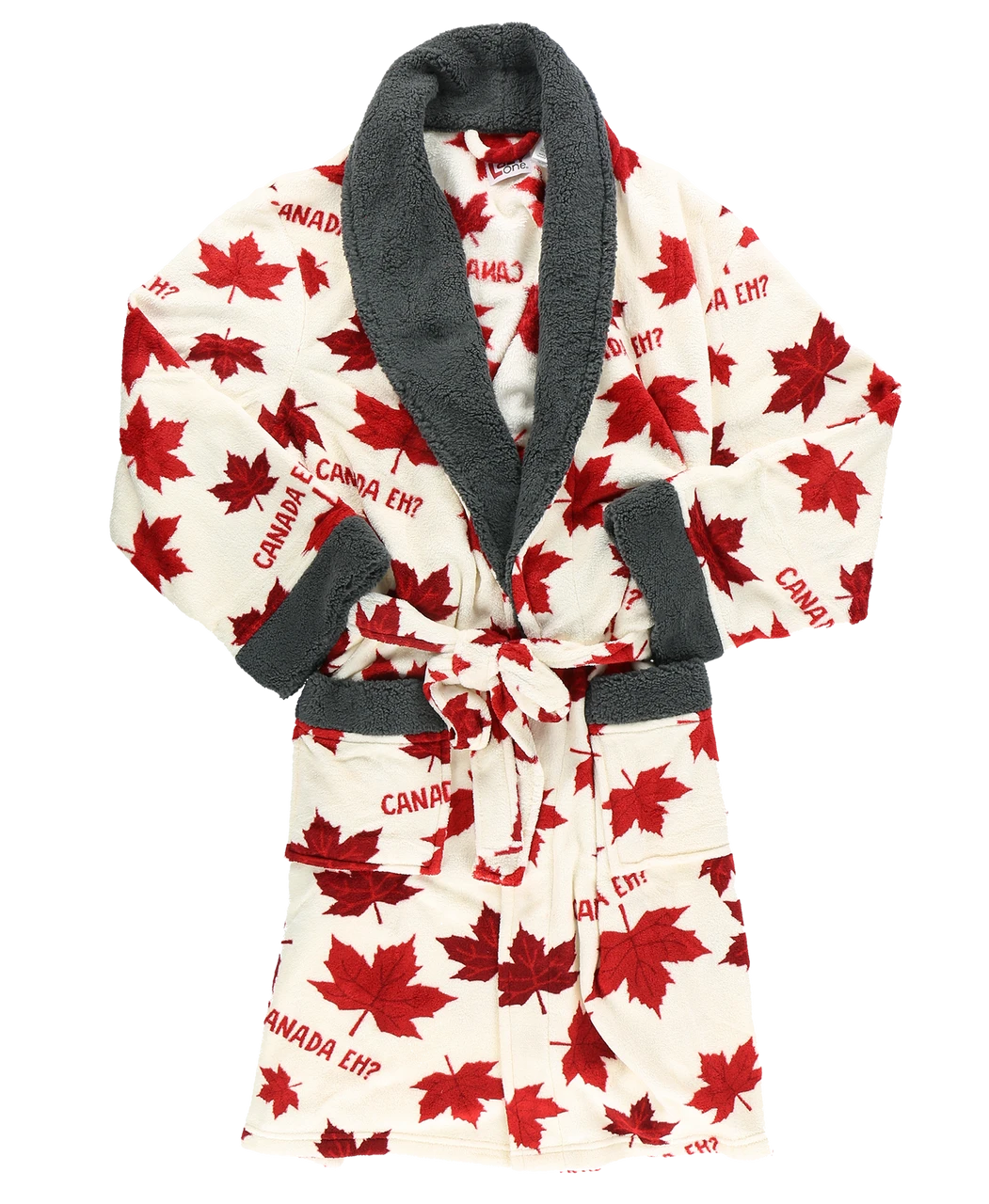 Stay warm while you relax around the house with our Canada Eh women’s bathrobe. This bathrobe will keep you warm while you relax during any cold Canadian day. This bathrobe features an all over maple leaf design with a dark grey trim. Warm and super plushy, our bathrobes feature a contrasting faux sheepskin trim, two deep, roomy pockets, and all the luxurious comfort you’d expect from a spa! You will be able to comfy and warm no matter where you are.