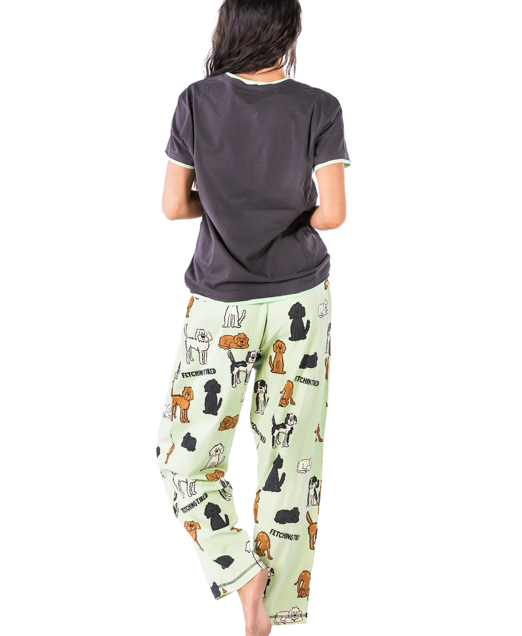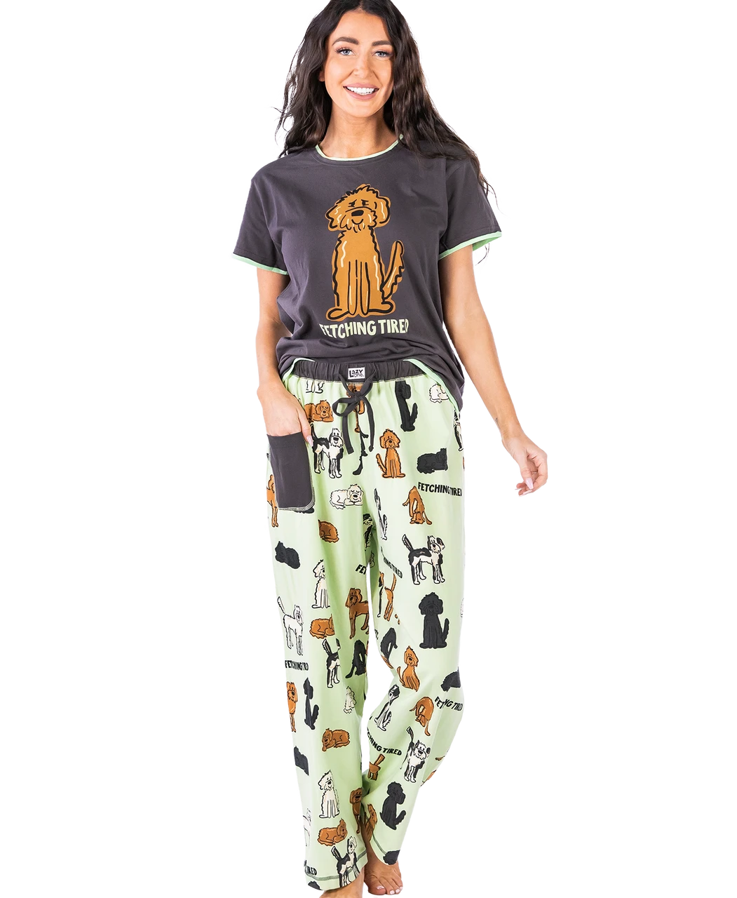 Whether you have a labradoodle or not you will love our Fetching tired pajama set. Featuring all the different colors of labradoodles one could ever need. Made from breathable 100% combed cotton for a soft blend of warmth and comfort, each tee features our cute labradoodle moose design on a heather grey shirt with raw-edged trim around the neck and sleeve, while pants have a contrasting front pocket and drawstring waist. Purchased as a set.