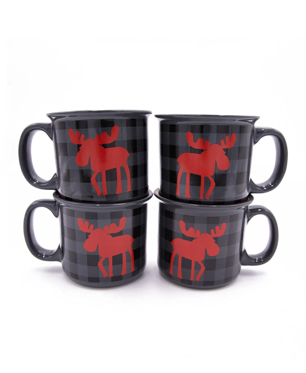 Looking for the perfect set of mugs for your home or cabin? Look no further, our Moose Plaid Grey mug four pack. Featuring a dark grey plaid with a fun moose silhouette. Each mug can hold 12 oz making it the best morning coffee companion.