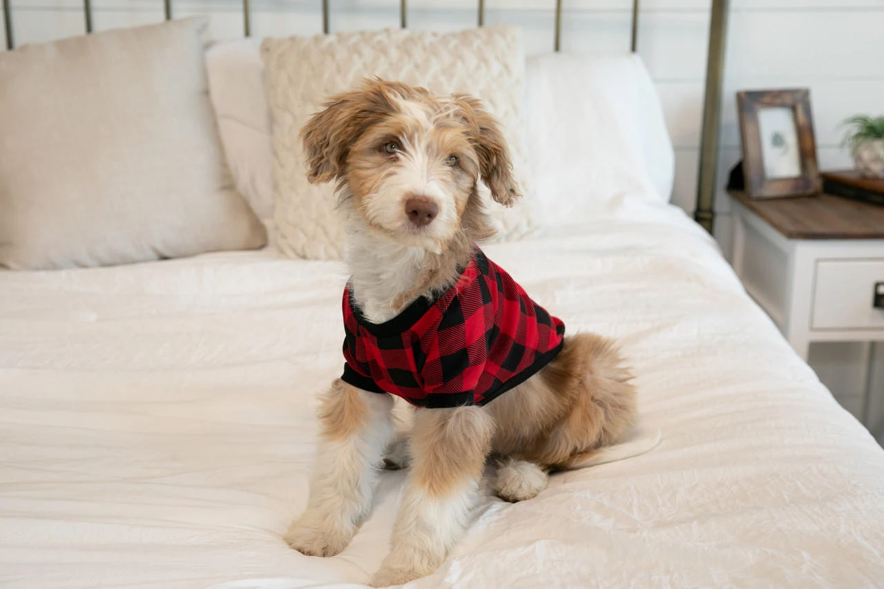 Our red plaid is a classic part of our family matching pajamas and now your dog can join in on the fun with our Red Plaid dog shirt. Made with 100% combed cotton giving your dog comfort while making them even cuter! This dog shirt goes great with our Moose Plaid and Bear Cheeks family matching collections.Â