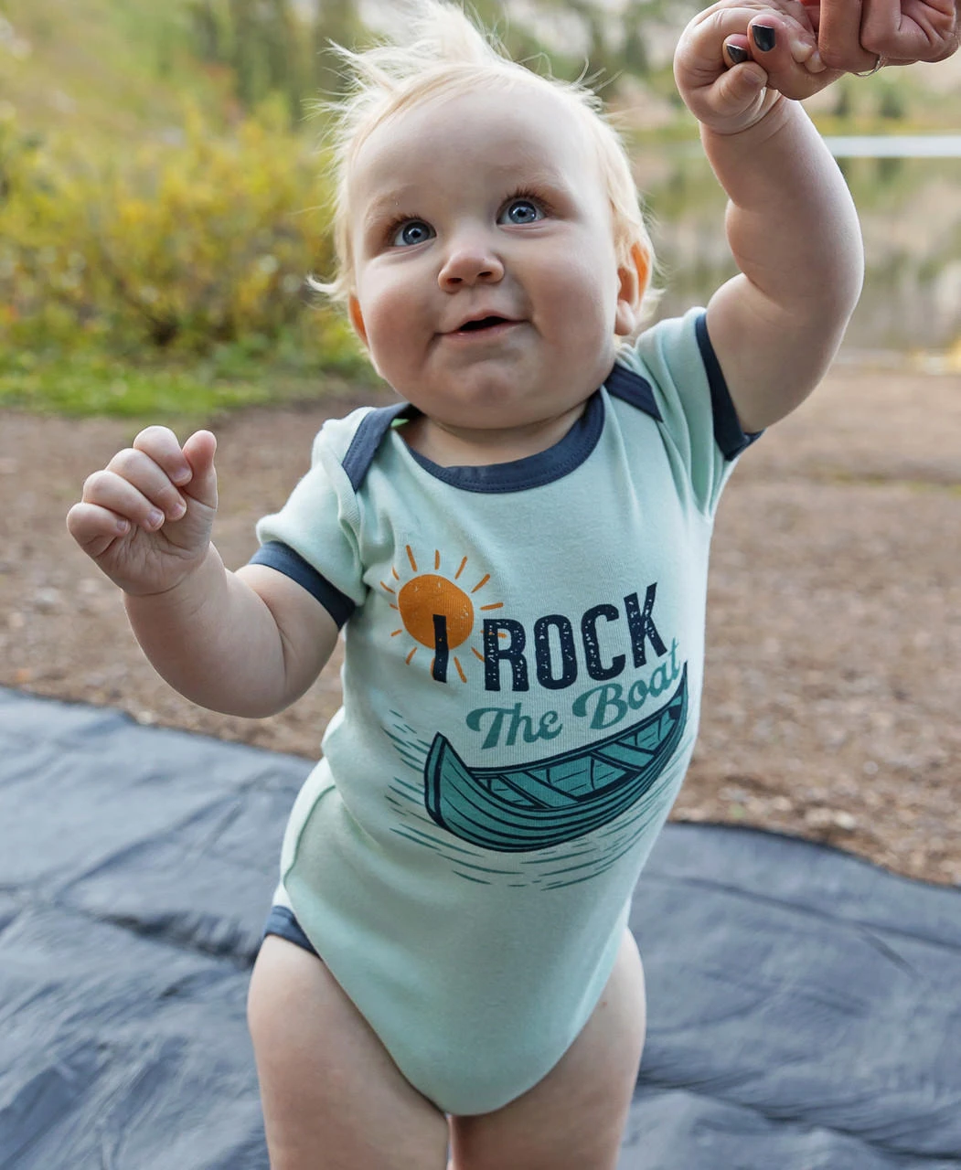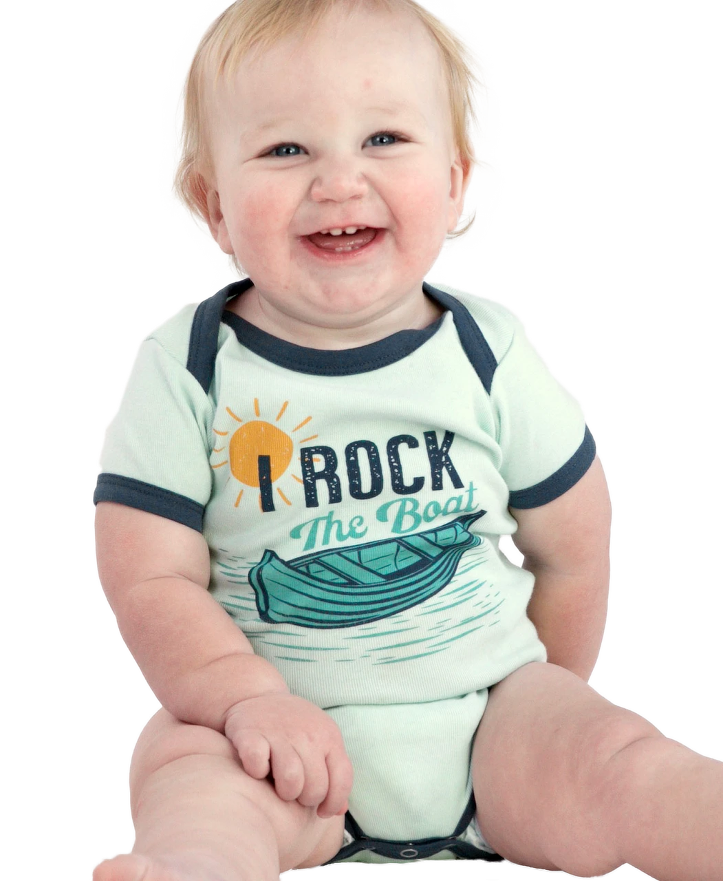 Our Rock the Boat infant onesie is perfect for those fun days spent by the beach or lake. Featuring the funny I rock the boat saying with a cute canoe design. Our infant creeper onesie are made with ribbed cotton for stretch, your child will have lots of room to move around! With snaps at the crotch and shoulder flaps for easy changes!