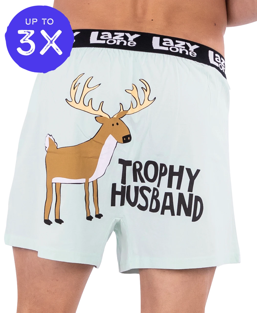 Let your husband know who the real trophy is with out Trophy Husband Funny Boxers. Made from soft 100% combed cotton knit, our boxers have a roomy fit with a button fly and an exposed elastic band. Featuring our funny Trophy Buck design. It’s easy to see why the butt stops here!